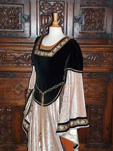 während das Oberkleid bzw. der geöffnete Surcot aus schwarzem Baumwollsamt eine