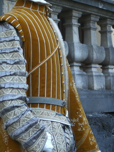 Renaissancekostüm eines Edelmannes 1560 Dem italienischen Gemälde von Allessandro Farnese nachempfunden besticht dieses Kostüm eines Jünglings durch sein Wams in ockergelbem Samt mit einer geometrisch angeordneten Verzierung mit Kordeln, die sich kontrastreich von den quergestreiften mit Borten reichverzierten Ärmeln und einer geschlitzten Pumphose mit einer zeittypischen Schamkapsel abhebt. Silberknöpfe und ein schwerer, kostbar mit weißem Fell, sowie einer Perlen- und Seidenstickerei verzierter Mantel aus Prägesamt runden das Ensemble ab.