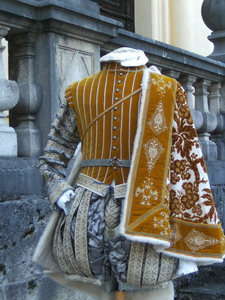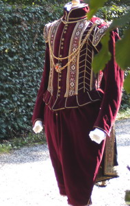 Aus burgunderrotem wattiertem Samt trägt der Edelmann dazu eine schmale, leicht wattierte, einfache „venezianische“ Hose und schlichte abnehmbare Ärmel, die in reizvollem Kontrast zu dem Blumen – und Grätenmuster stehen. Der Mantel aus satingefüttertem Seidensamt, eine mittelgroße Krause und ein kleines Samtbarett mit Perlen und Schwanenfedern runden das Erscheinungsbild des Adeligen ab.