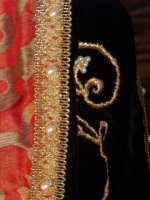Das schwarzsamtene Unterkleid und der Taillengürtel sind versehen mit einer goldfarbenen Handstickerei.