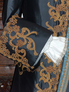 Rokokokostüm eines Höflings 1780 – 1790 befindet sich stilistisch bereits an der Grenze zum Klassizismus bzw. dem französischen Directoire mit seinem sehr enganliegenden, eleganten Justaucorps mit Stehkragen und den frackähnlich knappen Rockschößen. Die Robe besteht aus gestreiftem Taft mit plastischer Stickerei und Applikationen in Anlehnung an Blumen , Blätter und Fruchtständen. Charakteristisch für das sehr späte Rokoko steht hier die kurze Weste.