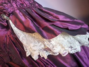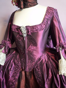 In satter, dunkel fliederfarbener Seide, entspricht diese Robe dem Stil der typischen „Robe á la francaise“, die, obschon der späten Zeit um 1760 zugeordnet, durchaus noch zu den üblichen Ballroben am französischen Hof entspricht mit seinem Zierrat wie Rüschen in großformatigen Voluten und dreireihigen Spitzenengageants.