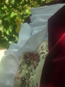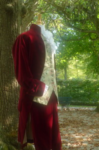 Rokoko-Kostüm eines Landedelmannes um 1760 Nach einem Modell der National Gallery in London gearbeitet in einem englischen, sehr schlichten Stil besteht die Weste aus einem Seidenlampas mit Silberknöpfen unter einem rotsamtenen Justaucorps, der in seiner körperbetonten Form mit engen Ärmeln und Stehkragen und dem Jabot aus duftigem Baumwollbatist schon den Stil des späten Rokoko andeutet.