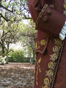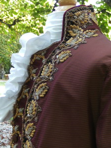 Als Pendant zur Robe der Rokokodame trägt der Edelmann dieses Ensemble aus pudrigen Rosenholztönen, bestehend aus einer enganliegenden Jacke, dem "Just au corp", einer unter dem Knie endenden Hose und einer langen Weste, die mit ihrem Jacquardgewebe in einem reizvollen Kontrast zu der unifarbenen Seidentaftqualität des restlichen Aufzugs steht. Die Knöpfe sind mit Stoff überzogen und finden in langen Reihen an Just au