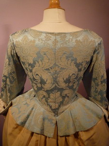 Caraco einer Edeldame 1735-1740 aus himmelblauem Leinenjacquard trägt die Dame als ländliches Kostüm am Tage mit einem pfirsichfarbenem Rock über einem kleinen Panier und einer kleinen Spitzenschürze einem kleinen Dreispitz oder einem leichten Strohhut, dazu passend ein Leinenbatist- Fichu.
